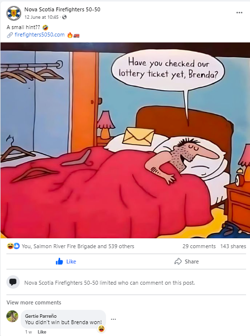 Winner announcements are some of the most engaging posts for raffling groups like the Nova Scotia firefighters.